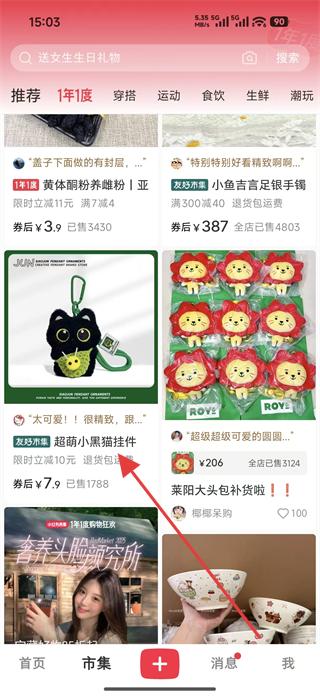 1、進入軟件市集頁面,瀏覽推薦商品如超萌小黑貓掛件等,了解商品價格、優惠及銷量,選擇感興趣的商品,開啟購物流程。