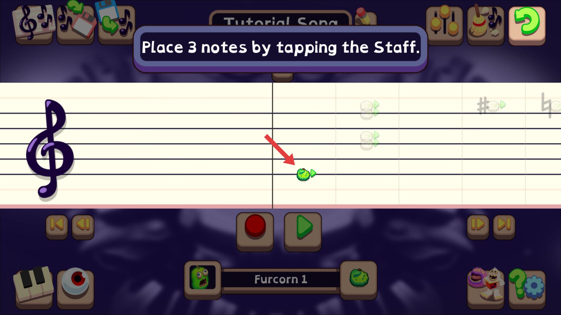 4、按照提示,在樂譜的五線譜上點擊三次,放置三個音符,完成基礎的音符布置任務,推進音樂創作進程。