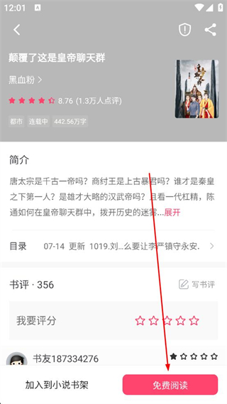 2、在小說詳情頁查看簡介目錄等內容,點擊免費閱讀按鈕,進入小說閱讀頁面,開始閱讀章節內容。