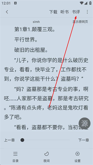 3、在閱讀頁面可切換章節調整閱讀設置,點擊書評選項,進入該小說的書評列表頁面,查看其他讀者的評價。