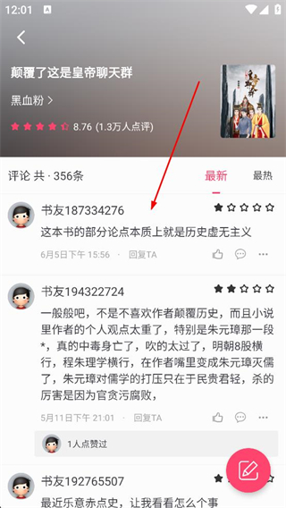 4、在書評頁面瀏覽不同讀者的評論內容,可對評論進行互動,也能點擊寫書評按鈕,發表自己的閱讀感受。