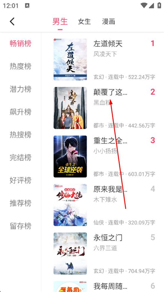 1、進入軟件男生頻道頁面,瀏覽暢銷書榜熱度榜等榜單,選擇目標小說點擊進入,查看該小說的基本信息及簡介。