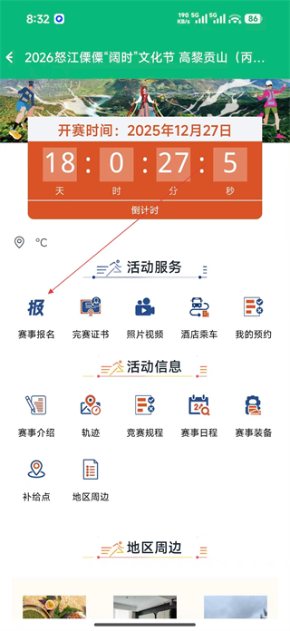 2、在賽事詳情,查看開賽倒計時及活動服務板塊,了解賽事報名完賽證書等功能,再查看活動信息板塊的賽事介紹等內容。