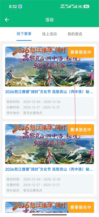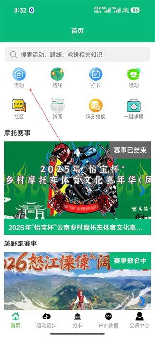1、進入平臺首頁,找到活動功能入口并點擊,進入活動頁面后選擇線下賽事分類,瀏覽展示的賽事列表,找到目標賽事條目點擊進入詳情頁。