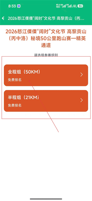 3、找到賽事報名相關入口點擊進入參賽組別選擇頁面,查看全程組和半程組的選項,根據自身情況選擇對應的參賽組別。