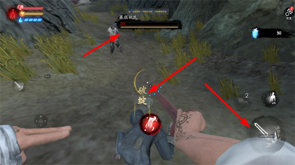 4、攻擊黑鴉紙魂等怪物,尋找破綻進行攻擊,提升劍術戰斗的傷害和效率,完成江湖任務獲取獎勵。