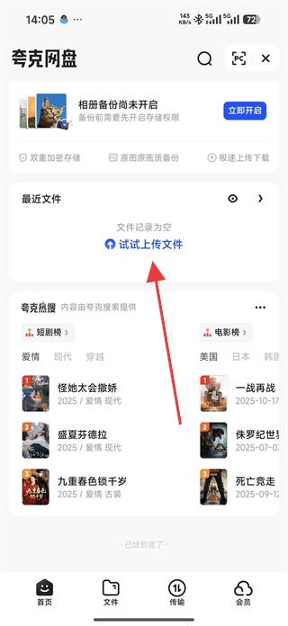 4、進入網盤文件頁面,可看到視頻、相冊、文檔等分類選項,若想上傳文件可點擊試試上傳文件按鈕,選擇要上傳的文件進行上傳。