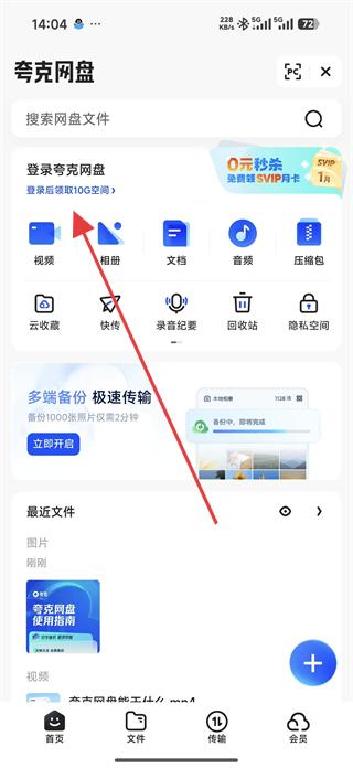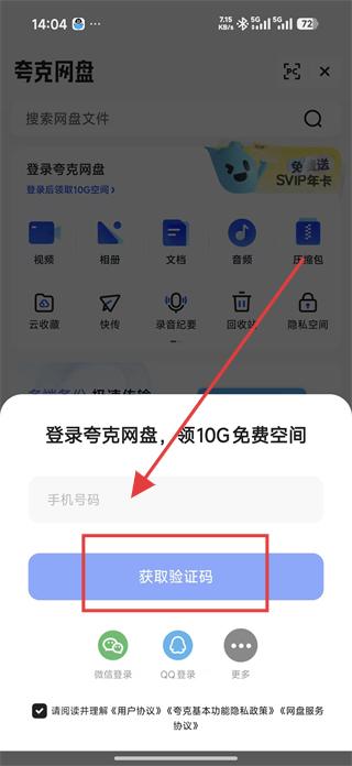 1、打開夸克網盤,點擊上方的登錄后領夸克網盤領10G免費空間,輸入手機號碼,點擊獲取驗證碼,完成登錄操作。