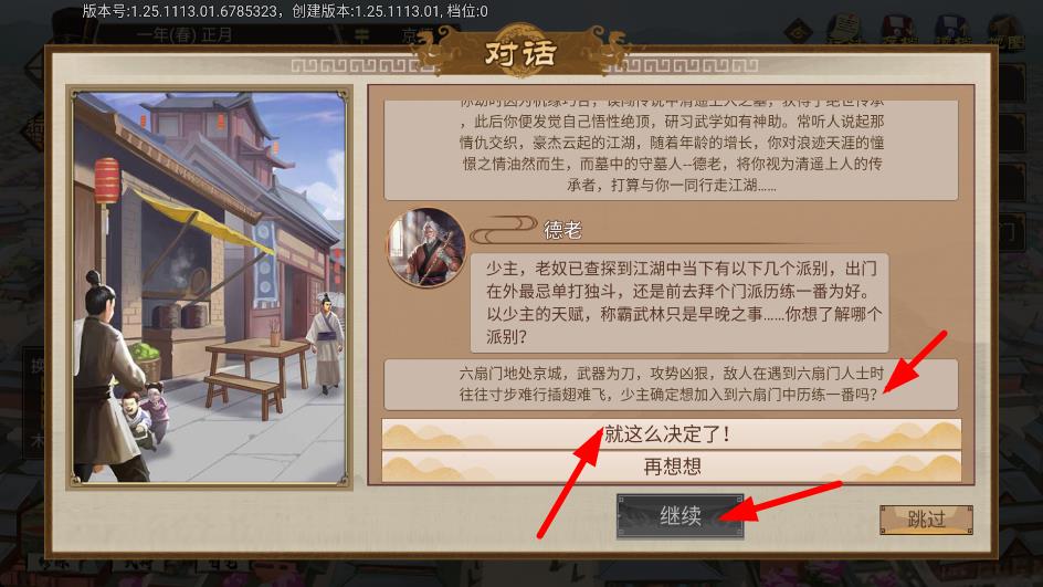 3、在劇情對話里選擇門派如六扇門,點擊就這么決定了,加入門派歷練,推進劇情發展,提升角色實力。