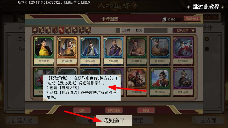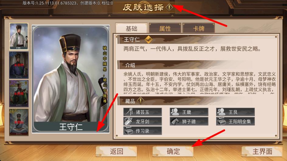 2、選擇角色皮膚如王守仁,點擊確定,定制角色外觀,了解角色背景和屬性,為后續游戲策略制定做準備。