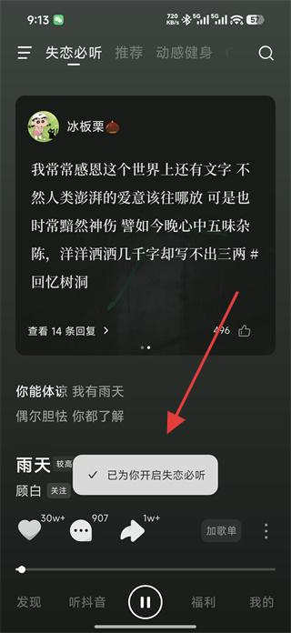2、在失戀必聽模式播放頁面,系統會自動播放相關歌曲如雨天,同時顯示已為你開啟失戀必聽的提示。