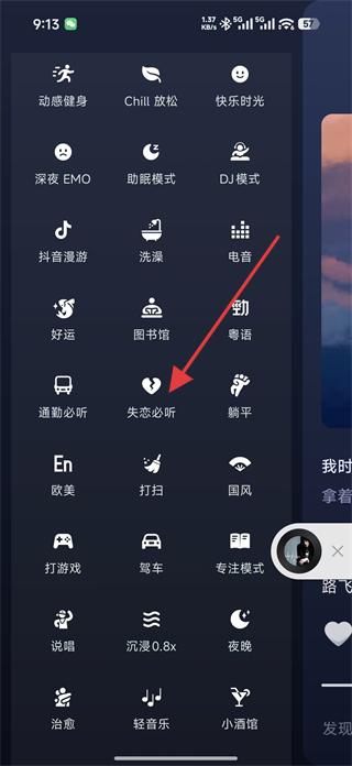 1、打開汽水音樂軟件進入模式選擇頁面,可選擇各類音樂模式如動感健身、失戀必聽等,點擊失戀必聽模式,進入該模式的音樂播放頁面。