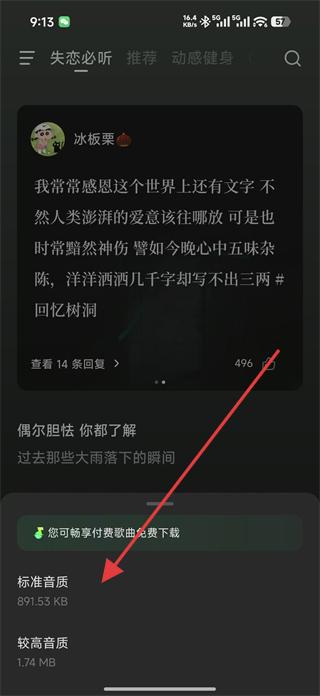4、若想下載歌曲可選擇音質如標準音質或較高音質,點擊下載按鈕,將歌曲保存到本地,方便離線收聽。