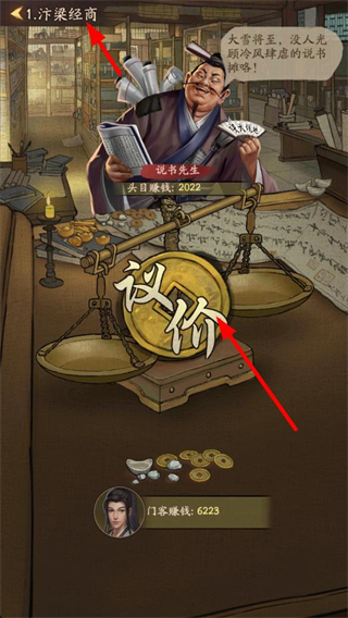 4、可在汴梁經商過程議價,與說書先生等角色議價,成功后獲取資源,提升經營能力,推進游戲進程。