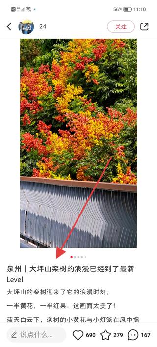 3、在筆記詳情頁閱讀關于大坪山欒樹浪漫景色的介紹,欣賞圖片,了解景色的特色與美感,增強對泉州景點的認知。