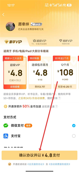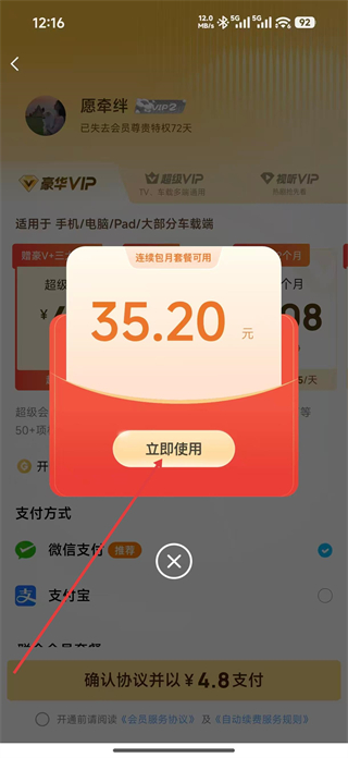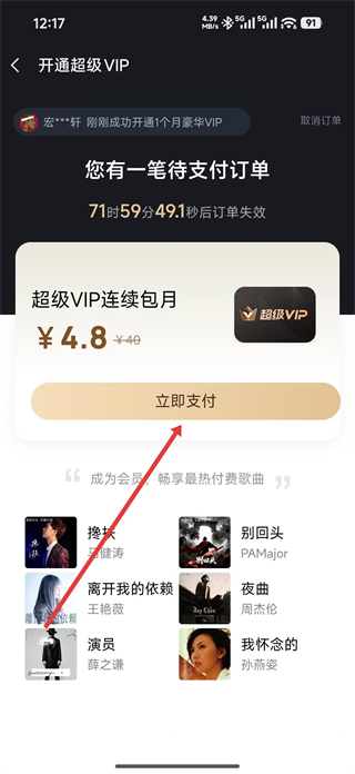 4、在待支付訂單頁面點擊立即支付按鈕,完成支付流程,成功開通超級VIP會員,享受對應的會員權益。