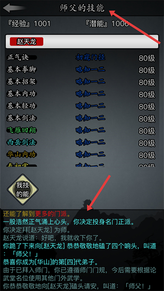1、可查看師父的技能,了解師父所會的武功,選擇學習師父的技能,提升自身的江湖戰力。