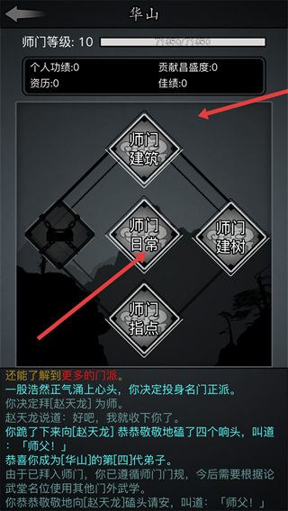 2、在門派界面可參與師門建筑、師門日常等活動,完成這些活動獲取貢獻度和獎勵,提升門派等級。
