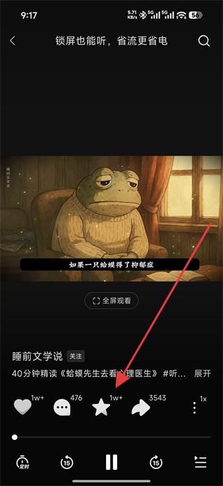 2、在播放頁面可進行點贊、評論、收藏、分享等互動操作,也可調整播放速度,全屏觀看視頻,享受聽書體驗。