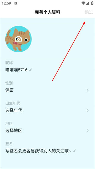 2、登錄后進入完善個人資料頁面,可選擇跳過,直接進入推薦關注頁面。