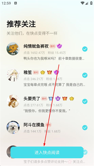 3、在推薦關注頁面,瀏覽推薦的作者,點擊進入快點閱讀,進入APP主界面。