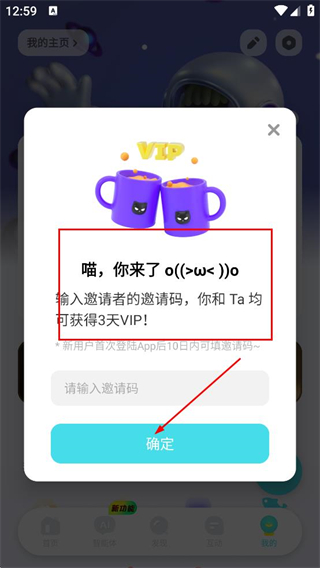 4、有邀請碼在彈出的邀請碼輸入頁面,輸入邀請碼后點擊確定,可獲取VIP權益,完成APP的登錄和初始化。