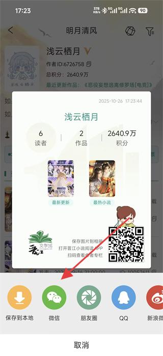 4、在分享選項頁面選擇保存到本地、微信、朋友圈等分享渠道,將作者信息或小說分享給他人。