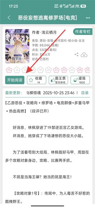 1、進入書城的衍生分類頁面,瀏覽戀愛物語、種田基建等分類推薦的小說,選擇惡役妄想逃離修羅場[電競]這部小說,進入小說詳情頁面。