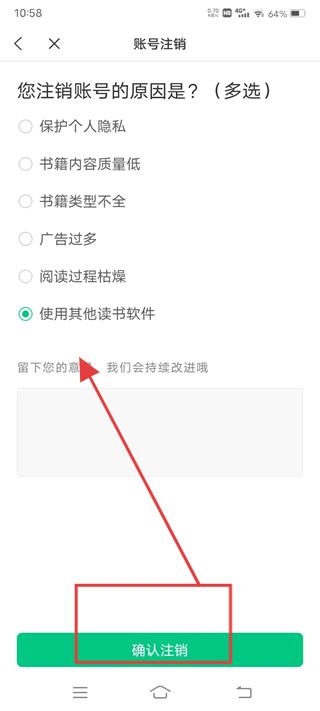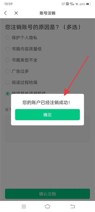 3、在賬號注銷頁面選擇注銷賬號的原因,如使用其他讀書軟件等,填寫意見后點擊確認注銷,提交注銷申請。