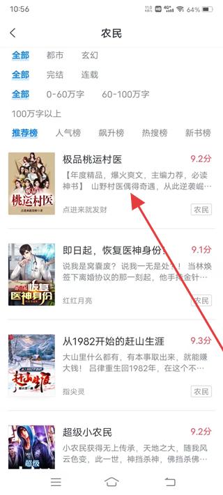 2、在農民分類頁面查看推薦榜的極品桃運村醫等小說,了解評分與簡介,挑選感興趣的小說,如極品桃運村醫,進入小說詳情頁。