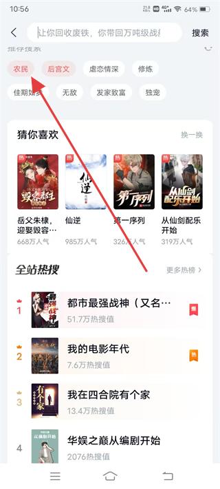 1、進入軟件搜索頁面選擇農民分類,瀏覽猜你喜歡的小說與全站熱搜,了解熱門小說的類型與熱度,開啟小說分類瀏覽體驗。
