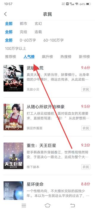 3、在農民分類頁面切換至人氣榜,查看武域八荒等小說,了解其人氣與評分,挑選感興趣的人氣小說,拓展小說選擇范圍。