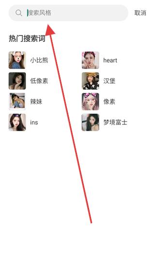 1、點擊搜索風格欄,可查看熱門搜索詞,如小比熊、低像素等,選擇感興趣的風格關鍵詞,也可直接輸入想要的特效名稱進行搜索。