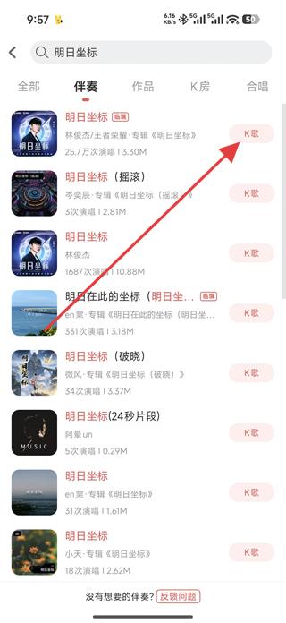 1、進入搜索頁面,選擇伴奏分類,找到感興趣的歌曲如明日坐標,點擊K歌按鈕,進入歌曲K歌頁面。
