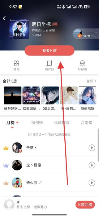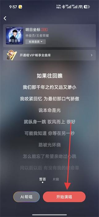 3、在演唱準備頁面點擊開始演唱按鈕,即可開始演唱所選歌曲,享受K歌樂趣,若想提升音質,可選擇開通VIP。