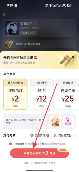 4、在會員開通頁面選擇會員套餐如連續包月、1個月等,選擇支付方式,點擊同意協議并開通按鈕,完成會員開通。