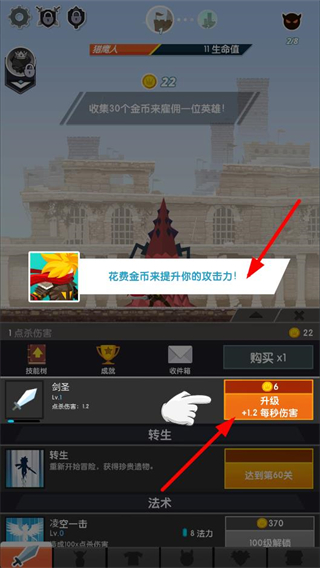4、花費金幣提升攻擊力,界面提示收集30個金幣來雇傭一位英雄,還能升級劍圣等技能,增強戰斗能力。