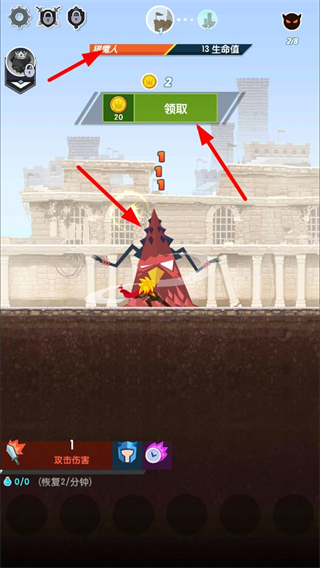 3、擊敗布爾后會遇到獵魔人敵人,界面出現領取按鈕,點擊可領取金幣獎勵,繼續攻擊獵魔人推進游戲進程。