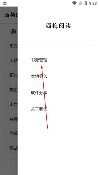 1、進入西梅閱讀設置相關頁面,找到書源管理選項并點擊,進入書源列表頁面,可查看已添加的各類書源信息。