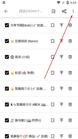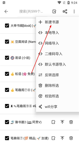 2、在書源列表頁面點擊右上角功能按鈕,打開操作菜單,可選擇新建書源本地導入等功能,按需選擇對應的書源操作方式。