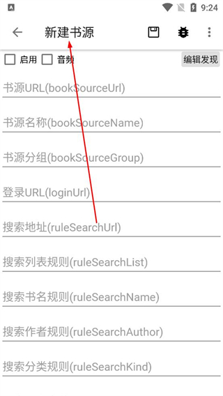 4、在新建書源頁面依次填寫書源URL書源名稱等各項內容,按需勾選啟用音頻選項,完成信息填寫后可保存該新書源。