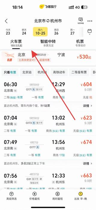 3、進入火車票預訂板塊選擇出發地北京和目的地杭州,選擇出行日期,瀏覽火車票列表,如06:30北京南到杭州西的高鐵等,選擇合適的車次查看詳情并預訂。