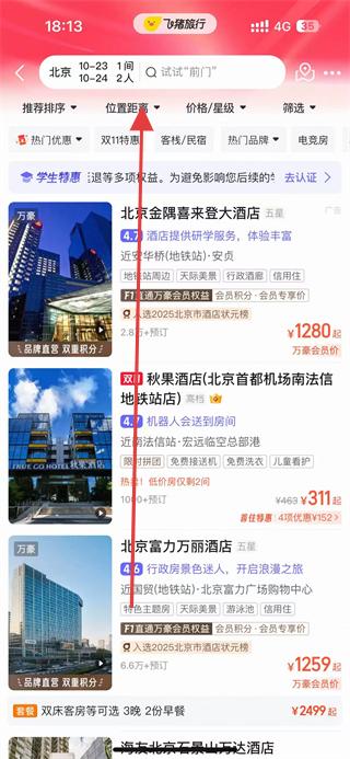 1、進入酒店預訂板塊可選擇位置距離、價格,星級等篩選條件,瀏覽北京的酒店列表,如北京金隅喜來登大酒店等,選擇合適的酒店查看詳情并預訂。