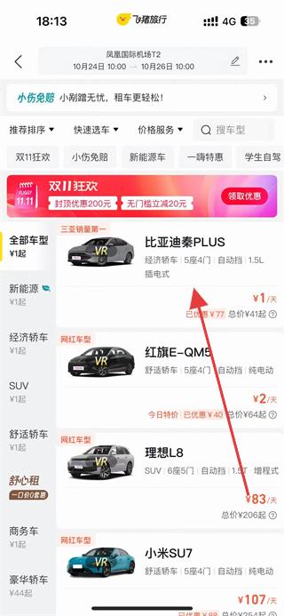 4、進入租車板塊可選擇車型如比亞迪秦PLUS等,查看雙11狂歡等優惠活動,選擇感興趣的車型查看租金和優惠信息,完成租車預訂,滿足出行的交通需求。