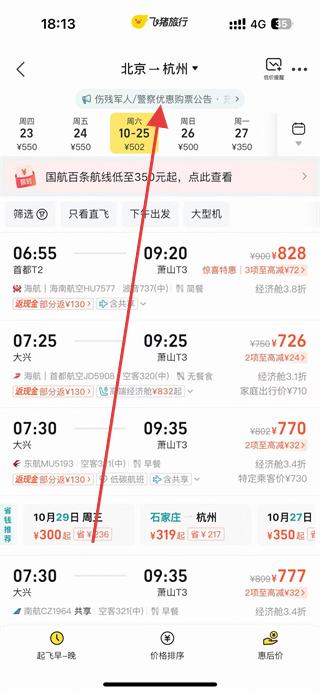 2、進入機票預訂板塊選擇出發地北京和目的地杭州,選擇出行日期,瀏覽航班列表,如06:55首都T2飛往蕭山T3的航班等,選擇心儀的航班查看詳情并預訂。