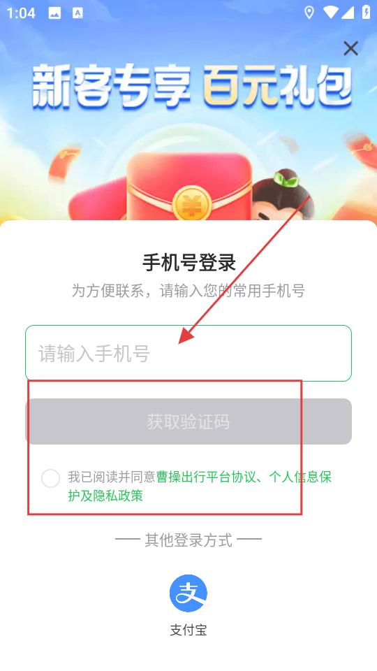 1、打開曹操出行APP,進入新客專享登錄頁,輸入常用手機號,勾選同意協議,點擊獲取驗證碼,完成登錄流程。