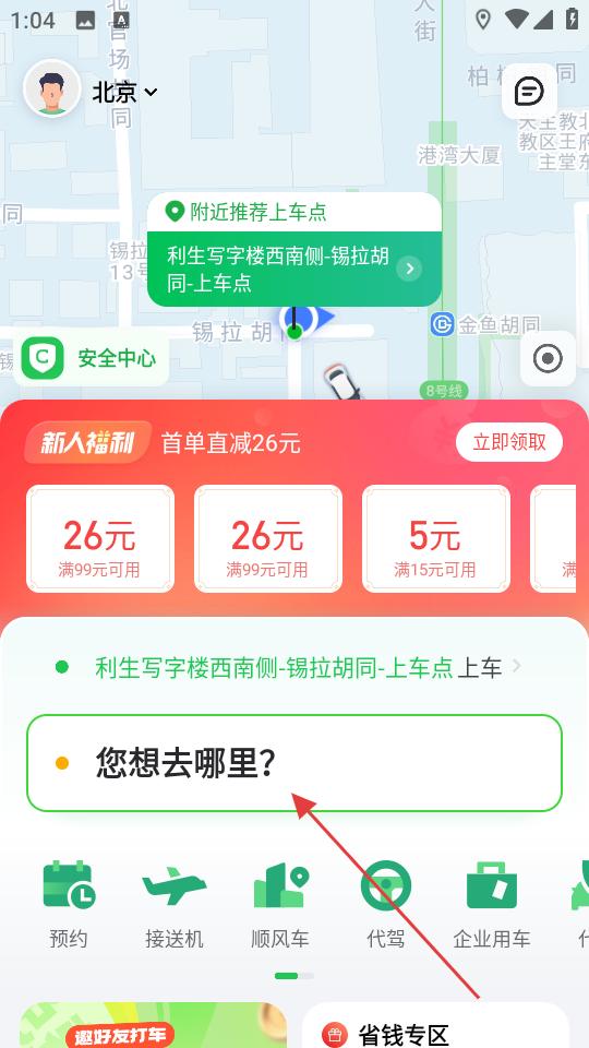 2、登錄后進入主界面,查看附近推薦上車點,點擊您想去哪里輸入框,準備填寫目的地,規劃行程。