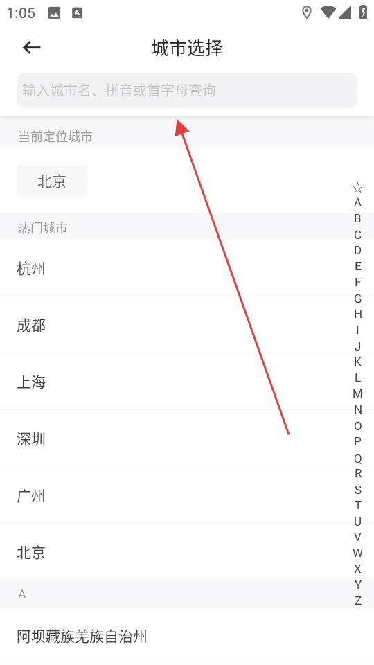 3、若需切換城市,進入城市選擇頁面,通過搜索框輸入城市名或在熱門城市列表選擇,完成城市切換。