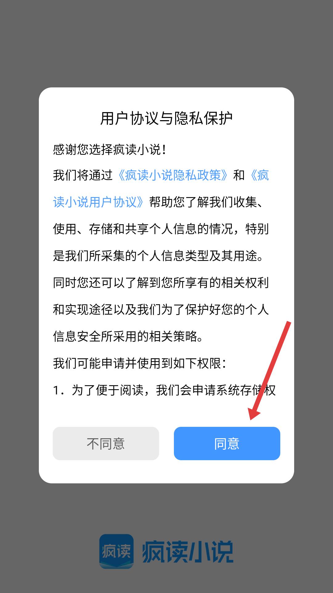 1、打開瘋讀小說app,彈出用戶協議與隱私保護提示,閱讀后點擊同意,進入書城頁面。