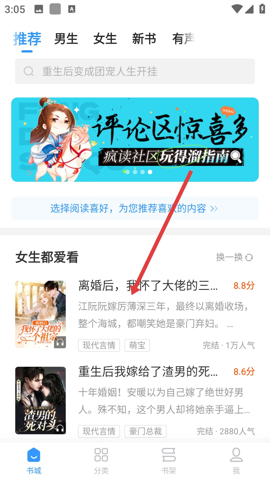 2、用戶在書城推薦頁,在推薦中瀏覽女生都愛看板塊,選擇感興趣小說,點擊進入詳情頁。